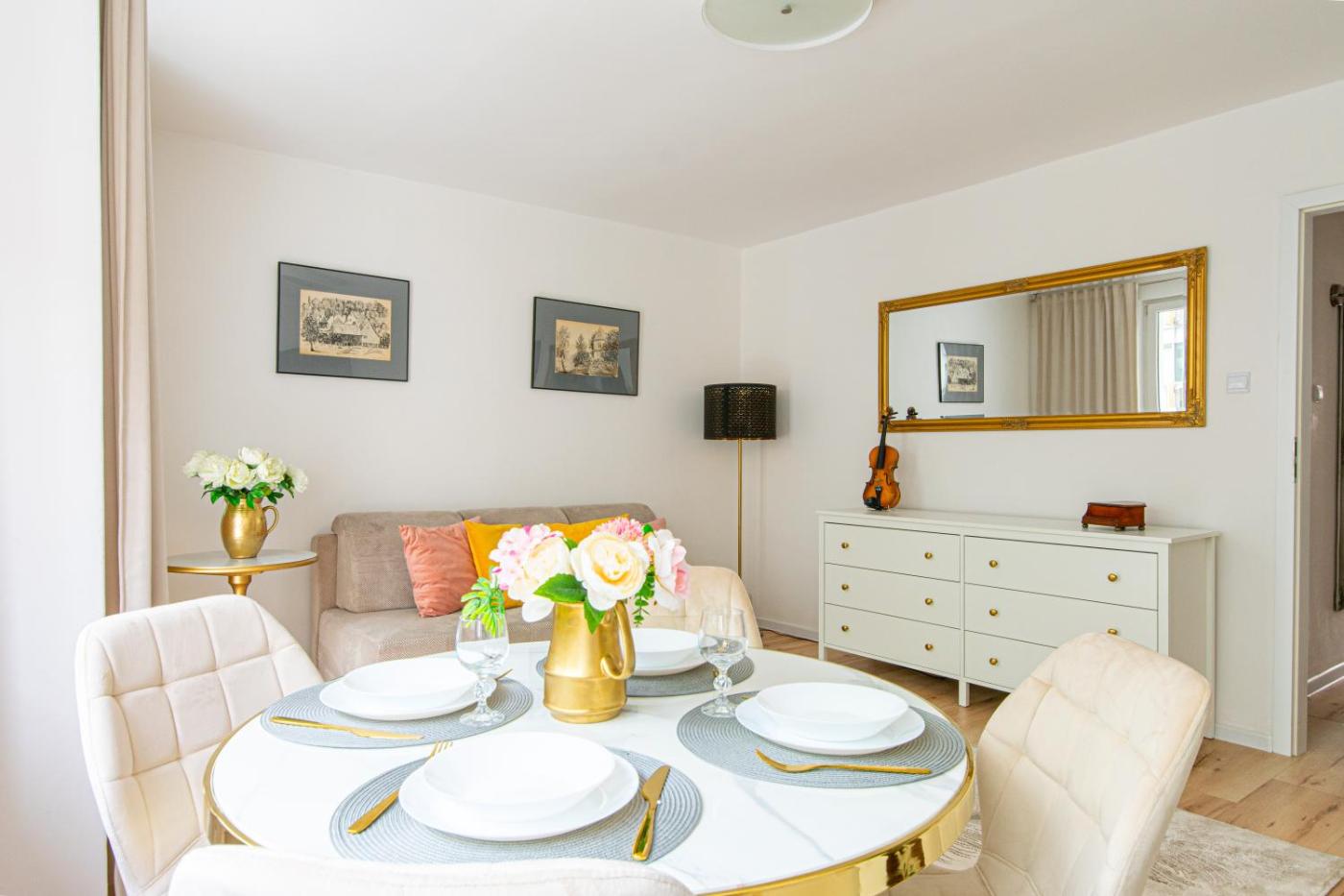 Apartament z 1 sypialnią. Boasting a private entrance, this apartment includes 1 living room, 1 separate bedroom and 1 bathroom with a shower and a hairdryer. In the fully equipped kitchen, guests will find a stovetop, a refrigerator, kitchenware and an oven. This apartment has a washing machine, flat-screen TV with streaming services, city views, as well as chocolate for guests. The unit has 2 beds. Apartament - 4 osobowy. Powierzchnia pokoju ok.: 45 mkw.